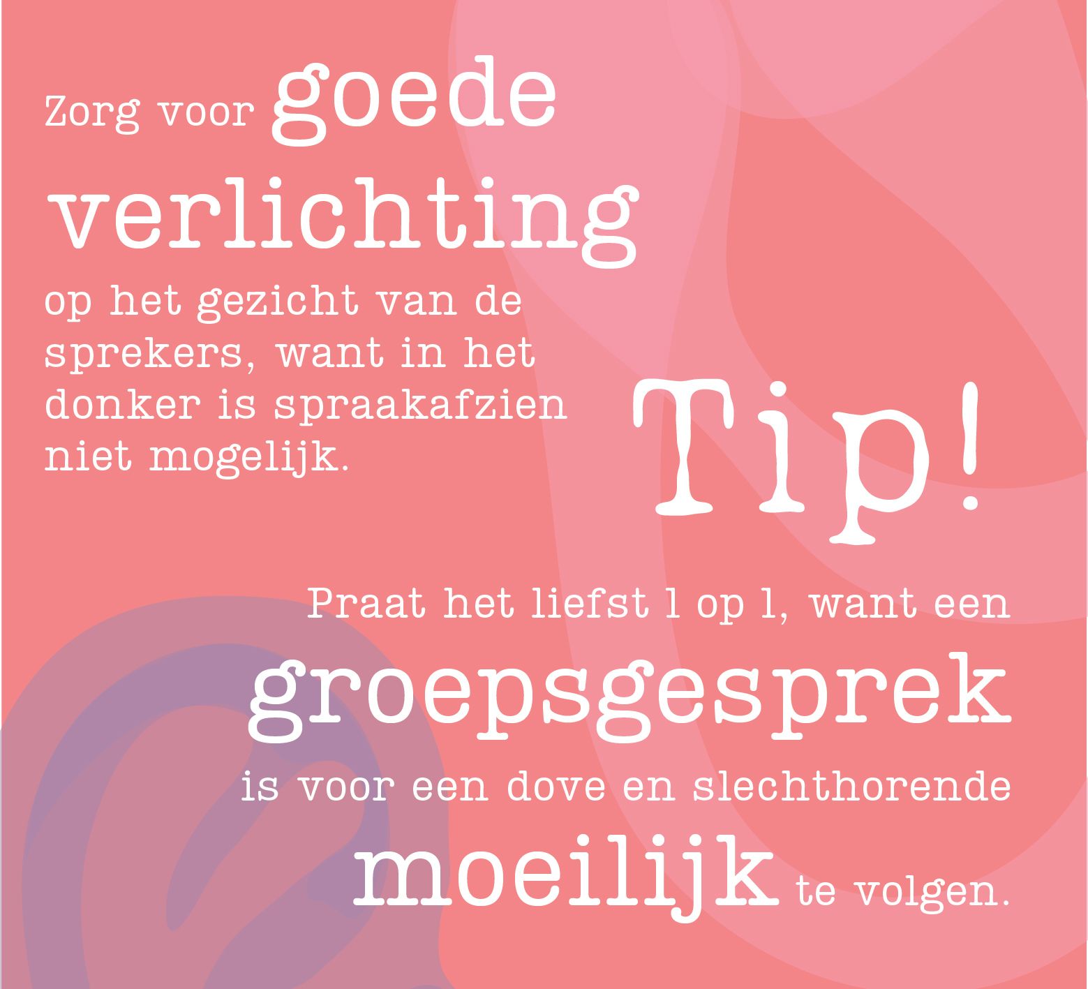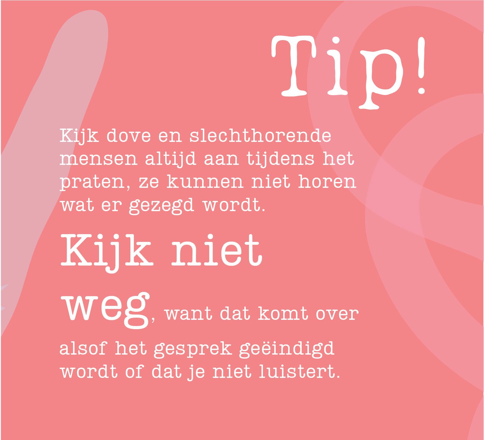 "Ik leef in een horende omgeving. Er is veel concentratie nodig om zoveel mogelijk mee te krijgen. Zeker in situaties waarin veel geluiden door elkaar heen klinken. Ik moet extra opletten op beweging van lippen en mimiek. Deze inspanningen kosten bakken met energie."
